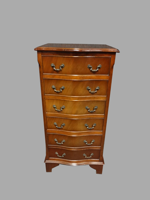 This is a very good mahogany serpentine chest of six drawers. brass handles, in good overall condition.