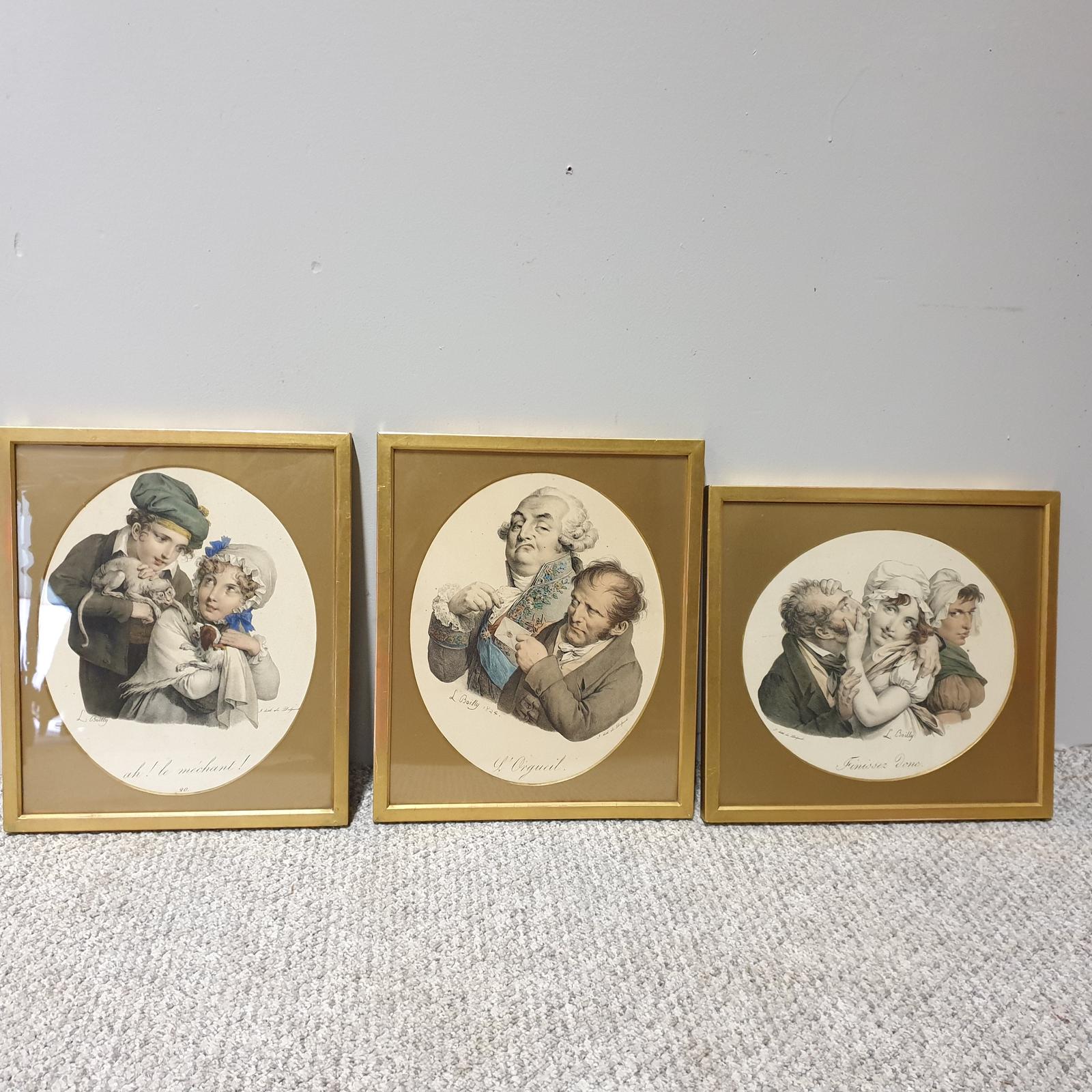 Signed L Boilly, three Regency hand coloured caricature prints, in original gilt frames, lovely condition.