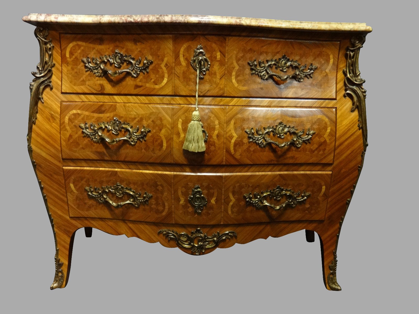 This is a very good French tulipwood three drawer chest of drawers with intricately worked parquetry panels, very good ormolu fittings, oak lined, cream and rouge marble top, in excellent original condition.