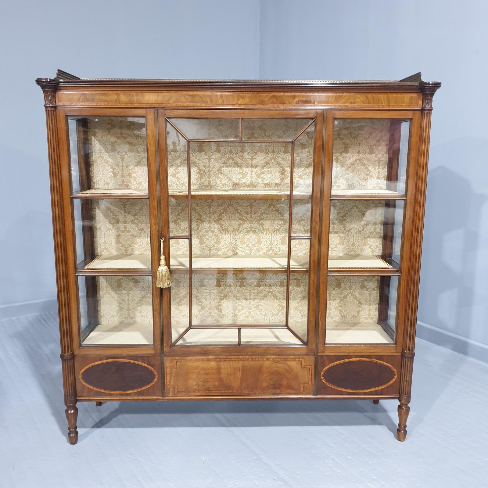 A super quality English mahogany display cabinet with inlaid banding and panels, wonderful brass gallery to the top, brass slamming strip, inlaid shelving, reeded corners with acanthus leaf tops, fully relined and in excellent condition.