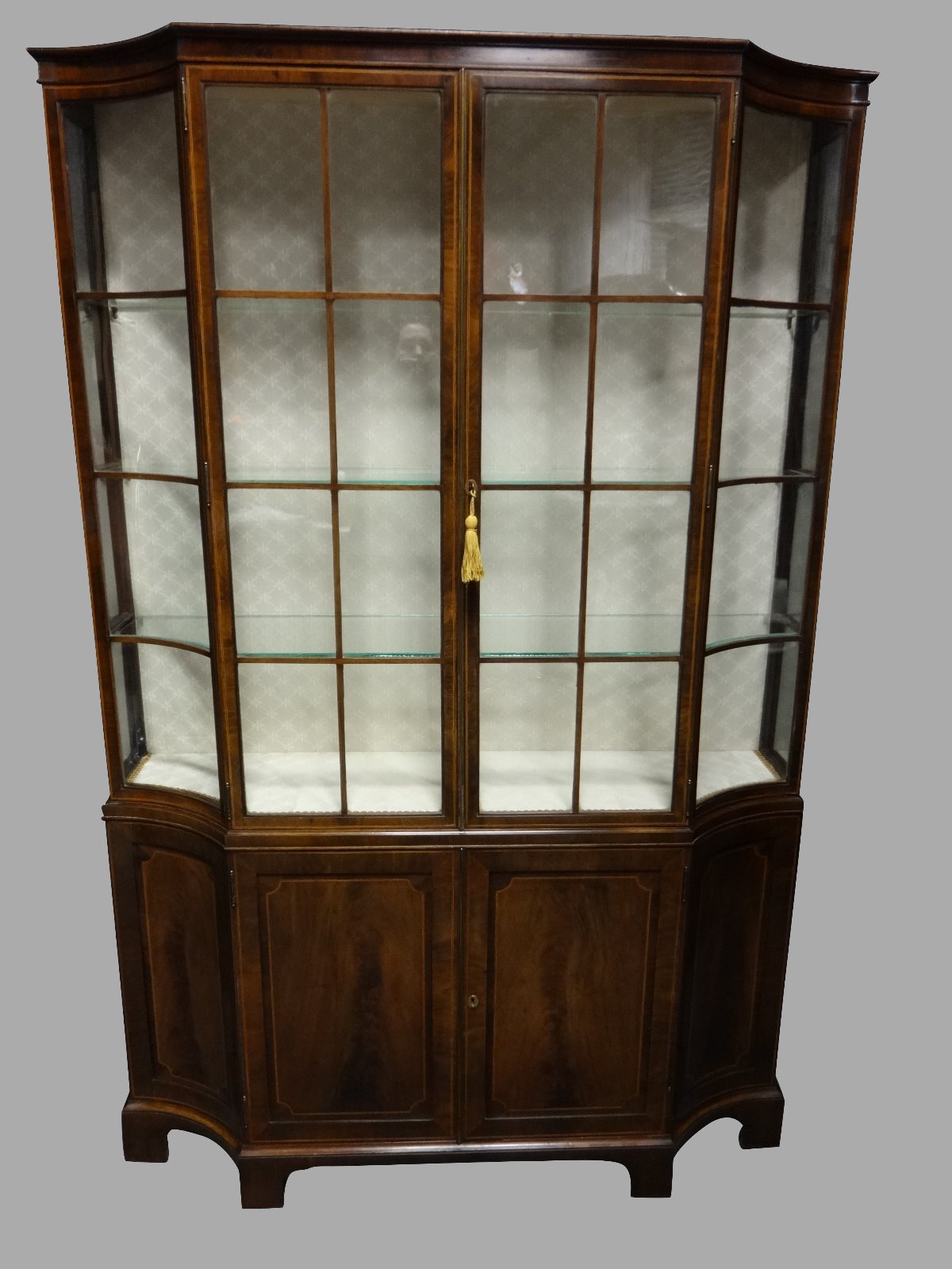 This is a top quality Edwardian mahogany display cabinet with ebony and boxwood stringing, concave glass sides, brass slamming strips three glass shelves, in very good condition.