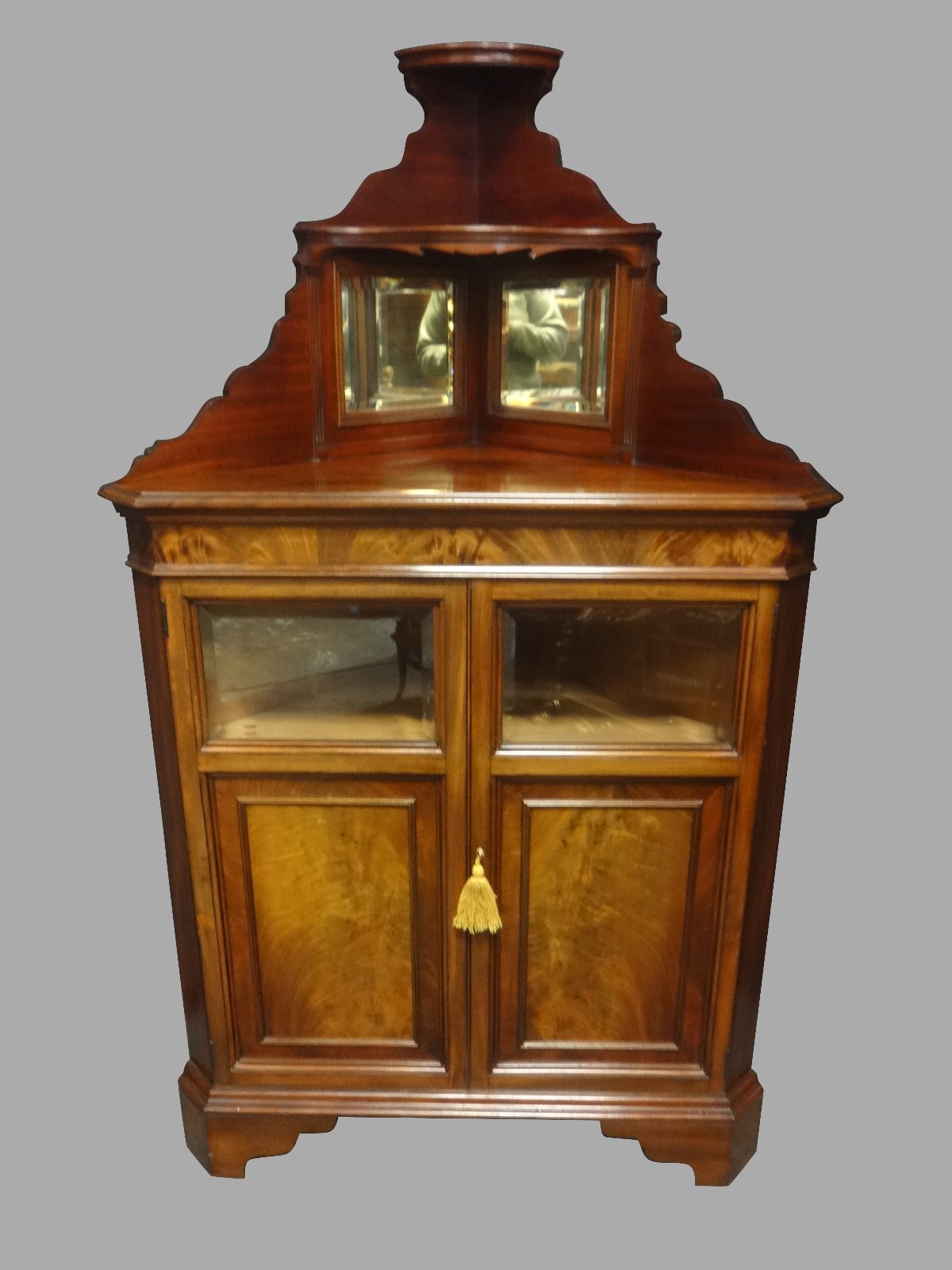 This is a top quality mahogany corner cabinet, bevelled glass double doors and bevelled glass reflective glass to the top, a very nice colour.