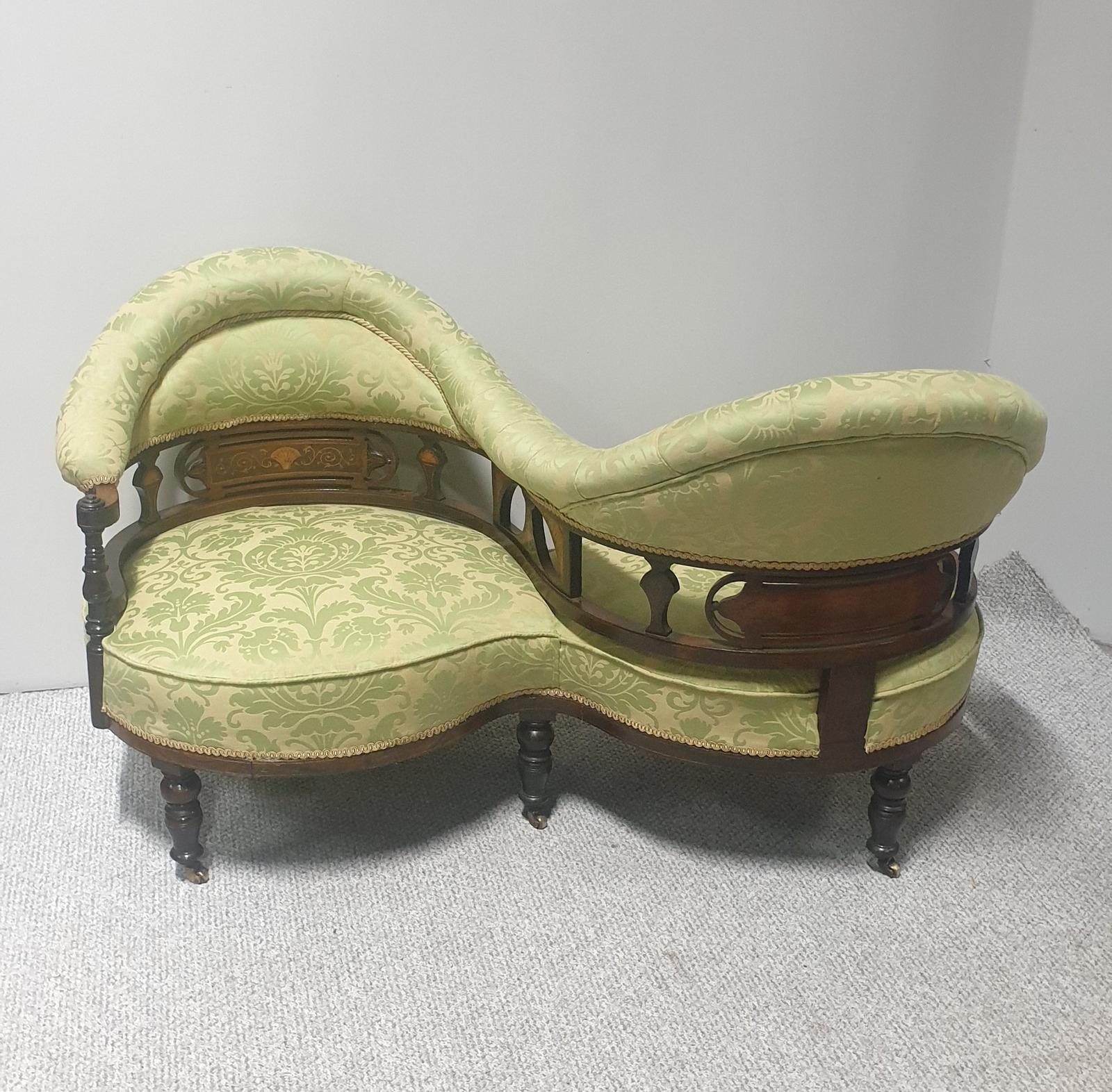 This is a superb Edwardian antique mahogany conversation seat with outstanding inlays, standing on turned legs with brass castors, and recently upholstered in oatmeal and green damask fabric, in excellent condition.