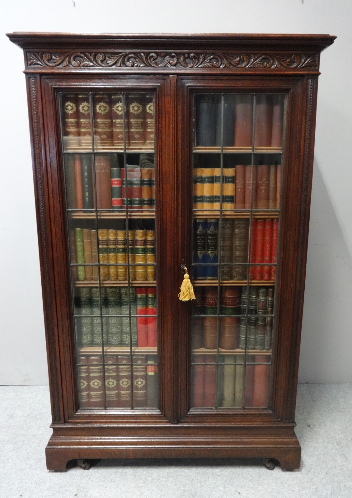 A top quality paneled oak bookcase with leaded glass doors, four adjustable shelves, carved frieze, excellent quality and condition, shoot bolt locking system.