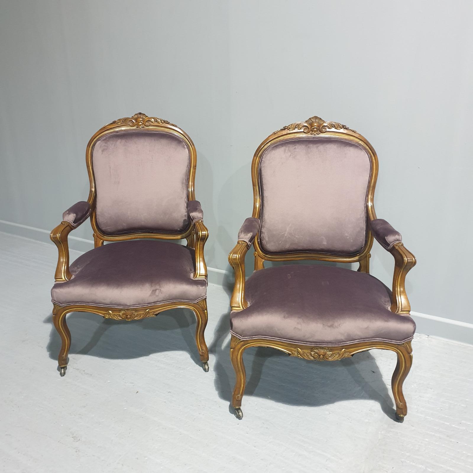 This is a superb pair of late 19th Century French antique walnut and parcel gilt armchairs or library chairs, newly upholstered in plumb velvet, in excellent original condition.