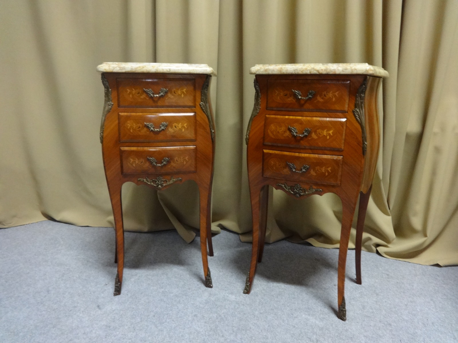 A very nice pair of French tulipwood bedside lamp chests, with brass mounts and marquetry inlays, quality marbles, and in excellent original condition.