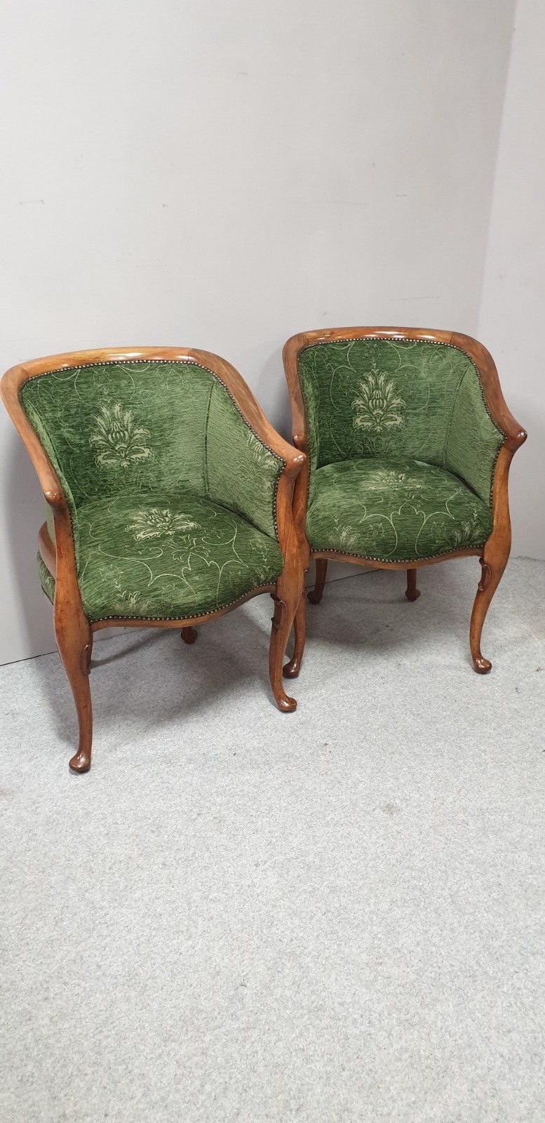 An excellent quality pair of solid walnut horseshoe shaped tub/easy chairs, newly upholstered and in excellent condition.