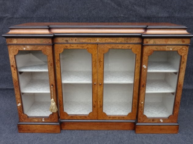 This is a stunning quality 19th Century antique rosewood breakfront cabinet. It has a caddy top with ebony mouldings, excellent quality marquetry and bone inlays to the doors and sides.