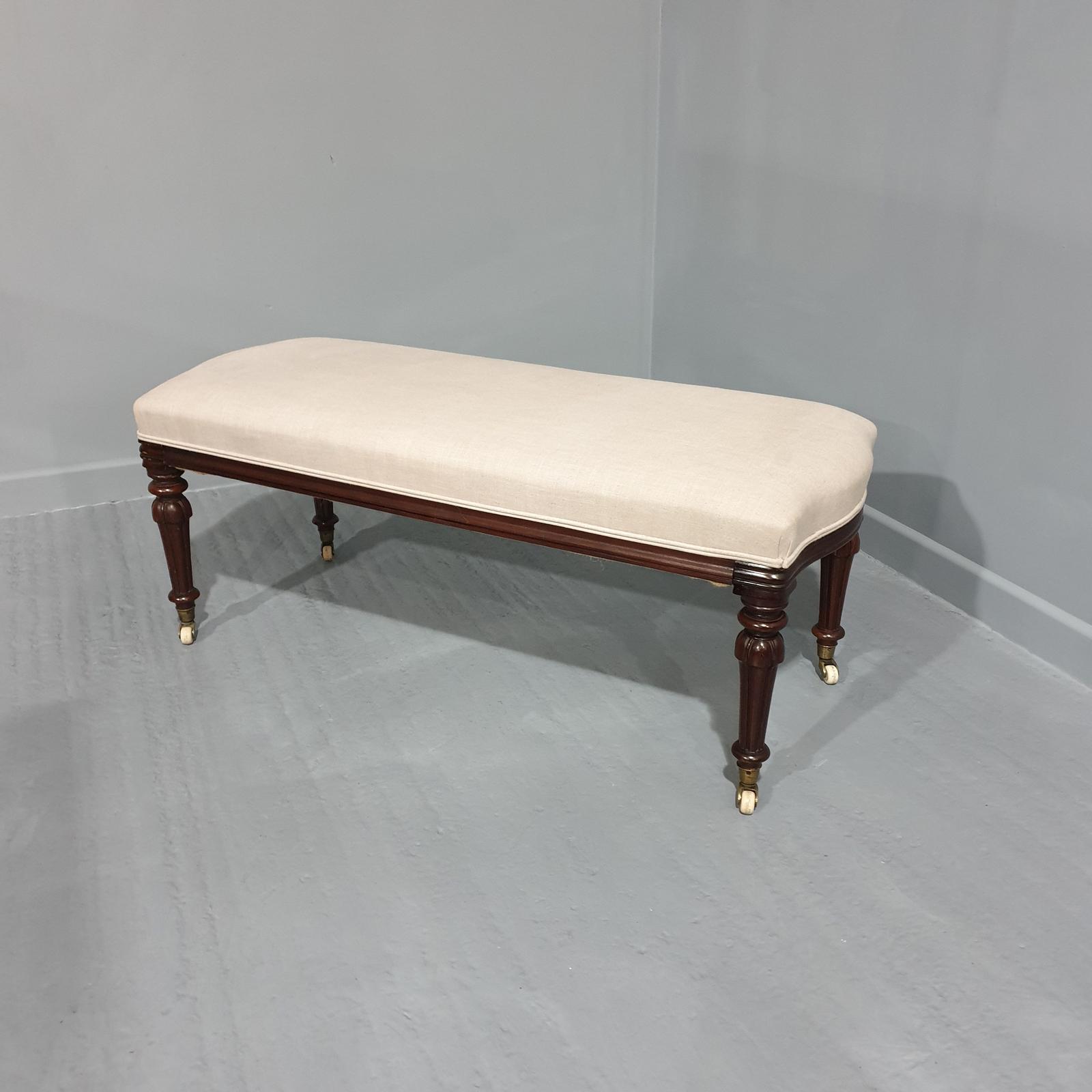 This is a superb quality late 19th Century Victorian antique mahogany window seat or bed end, original condition, recently reupholstered in natural linen fabric, excellent condition throughout.