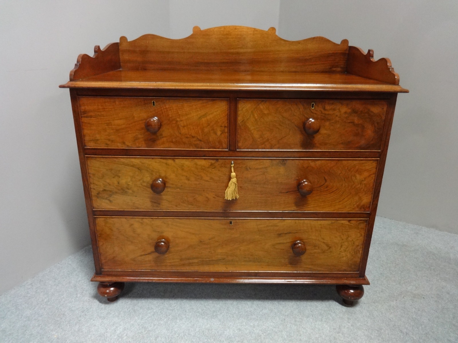 This is a superb quality 19th Century Victorian antique four drawer figured walnut chest of drawers with shaped back rail, in superb original condition with a great colour, key included.