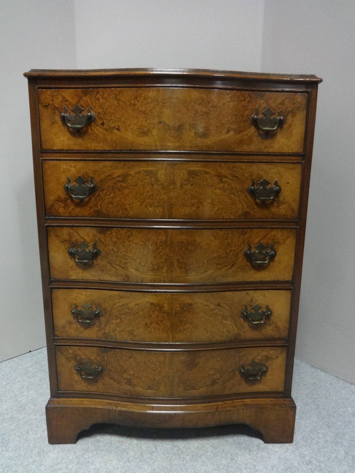 This is a very good burr walnut serpentine chest of five drawers with brass handles, excellent colour and condition.