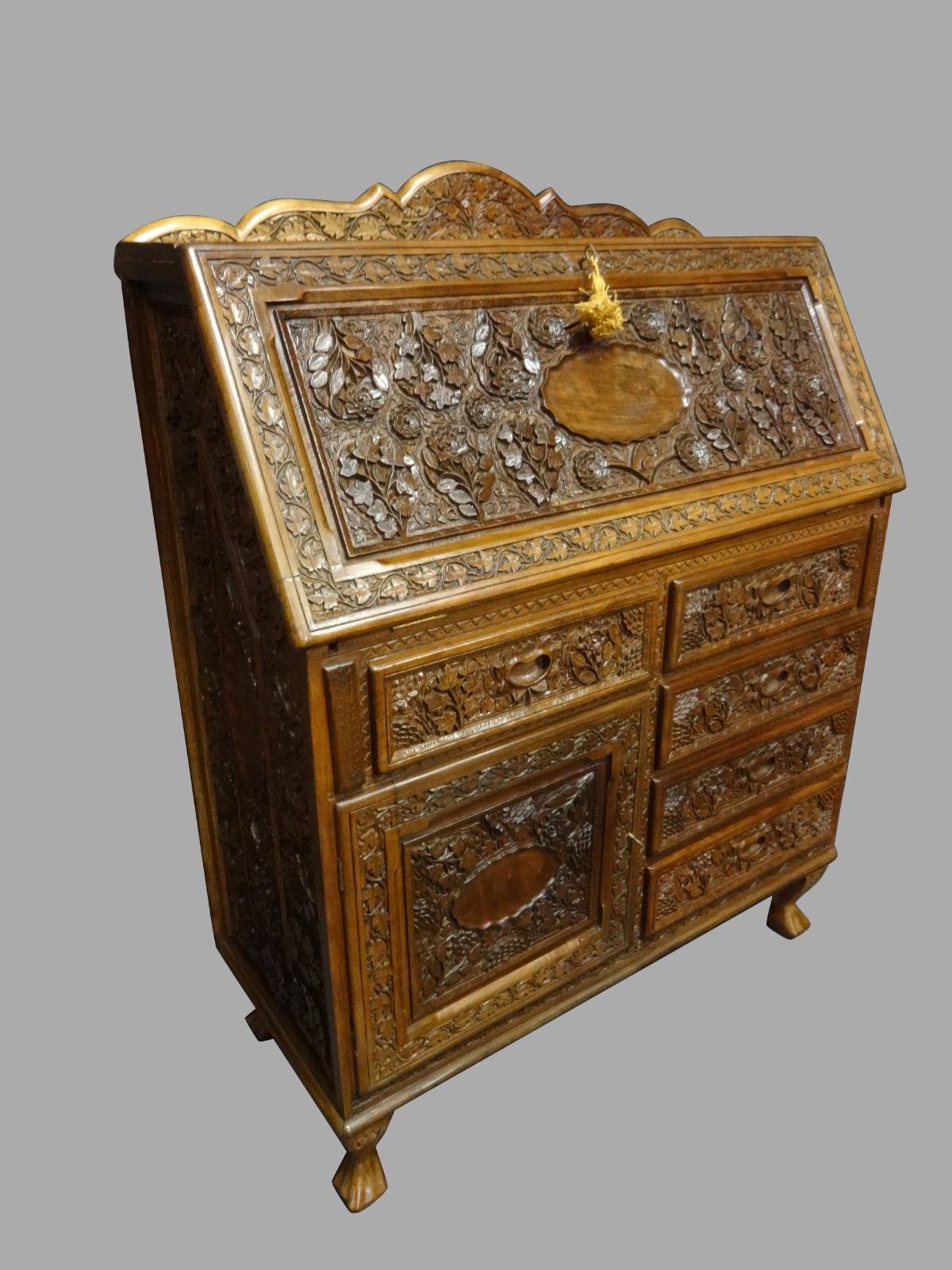 This is a lovely Asian bureau with very crisp carvings, five drawers and cupboard below a fall front revealing drawers and pigeon holes, in excellent condition.