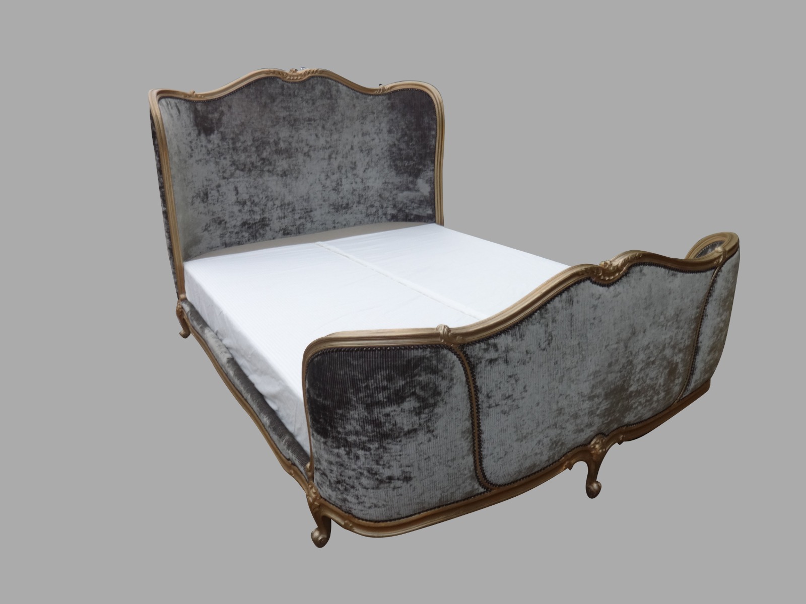 This is a good curved French 5ft bed with original grey plush upholstery and gilt woodwork, comes with two piece original box bed base, in very good condition.