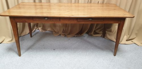 A wonderful golden oak French farmhouse dining table with two drawers, on square tapering legs, in very good overall condition.