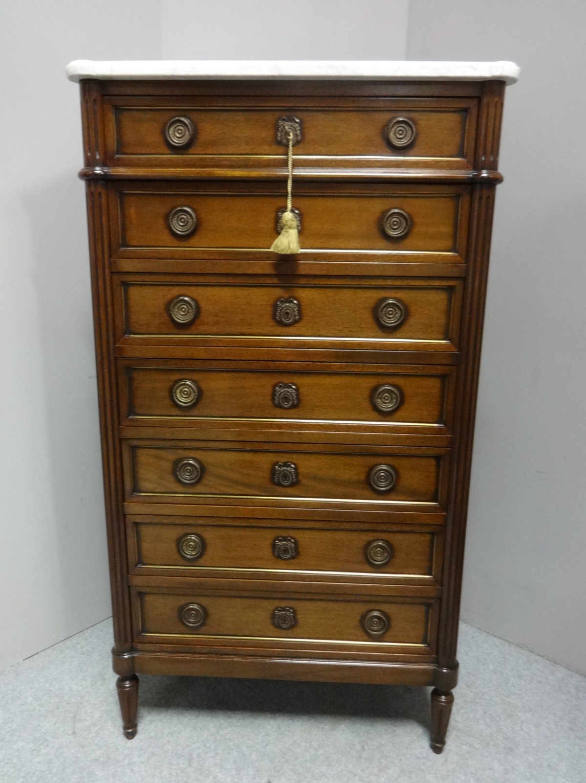 A very good French mahogany seven drawer tall chest of drawers with marble top, with brass ring handles and escutions, in excellent condition.