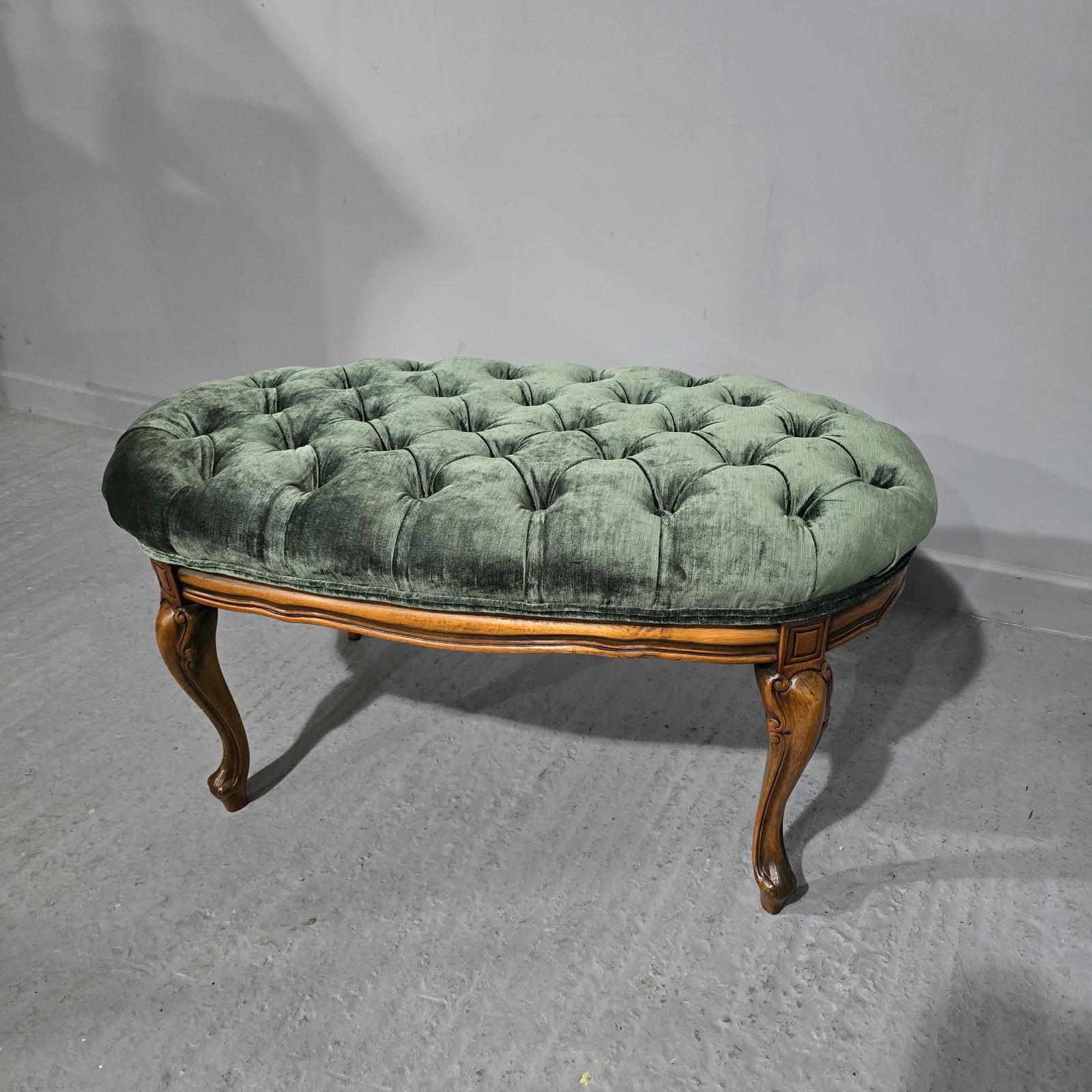 This is a super early 20th Century French antique walnut duet oval stool deep buttoned and covered in teal velvet, in overall excellent condition.
