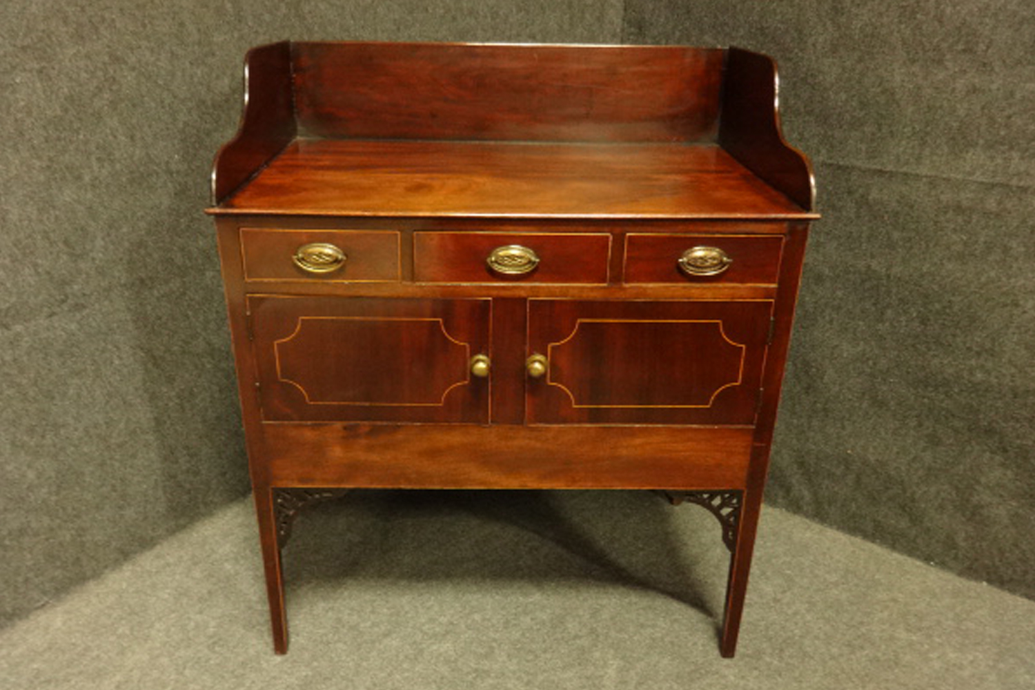 This is a very good inlaid mahogany washstand with two doors and three oak lined drawers, original brass handles with Staffordshire knot motif, in good overall condition.