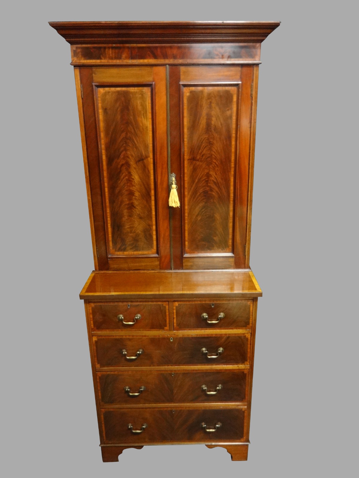 A very good mahogany cabinet, bookcase with inlaid satinwood banding, standing on five drawer chest, in very good condition.