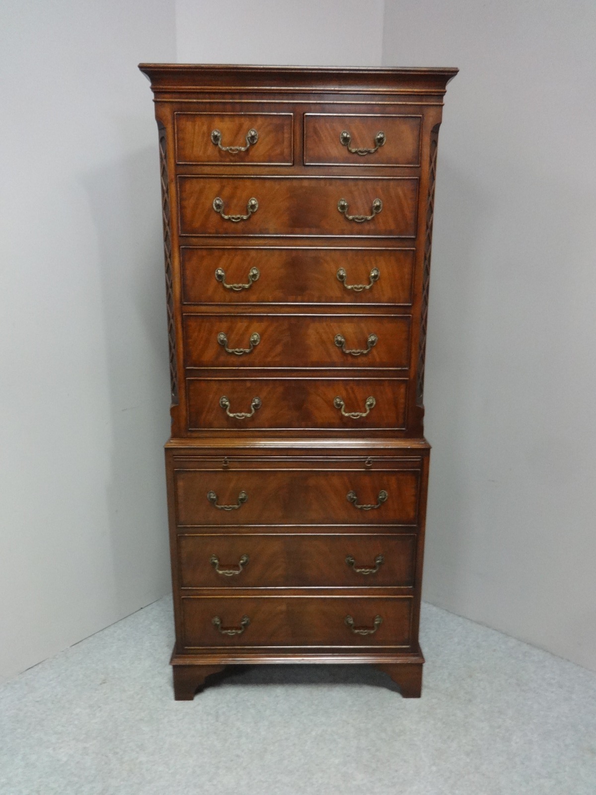 A very nice 'Georgian style' mahogany chest on chest of drawers with brushing slide, brass handles in excellent condition.