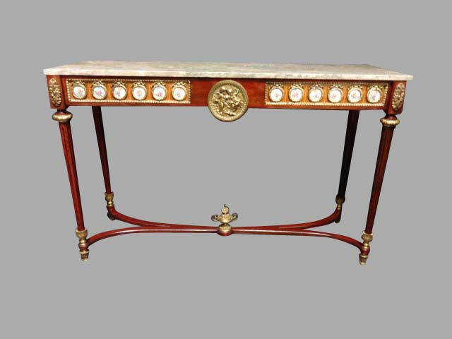 This is a very good early 20th Century mahogany console table with brass mounts, limoge style roundels and an excellent marble, in very good condition.