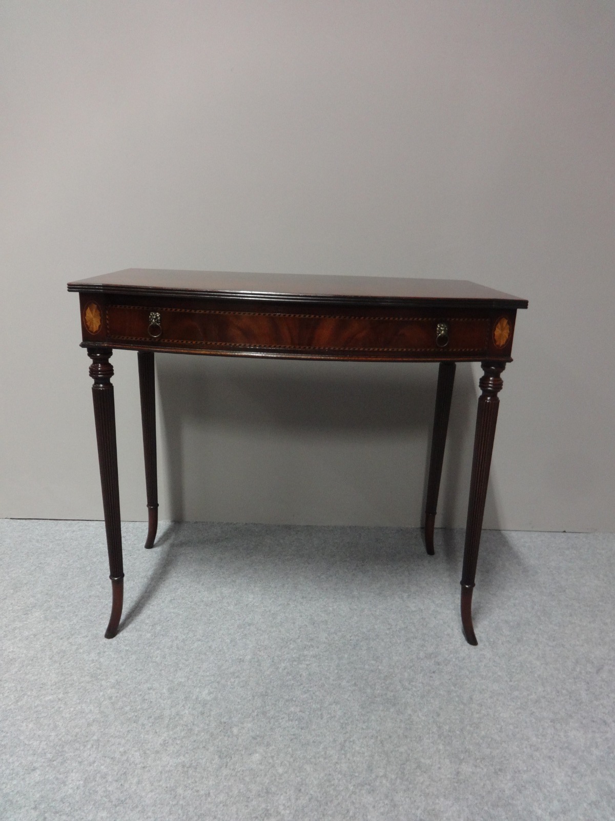 An excellent quality bowed side table in mahogany with good inlays, reeded outswept legs, single full width drawer, excellent colour and condition.