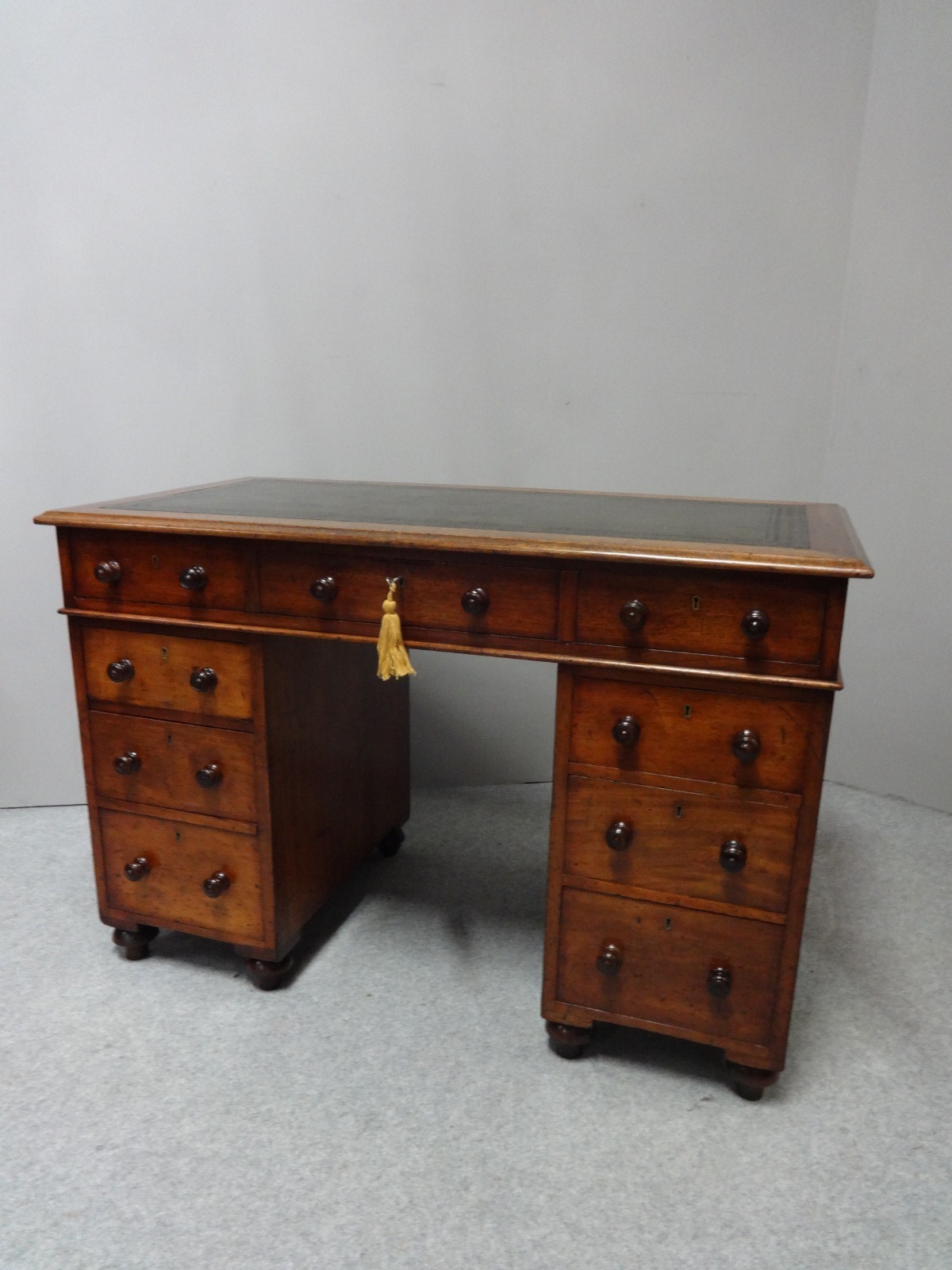 A very nice double pedestal campaign desk, in mahogany with turned mahogany knobs, green leather, standing on turned feet, all in very good original condition. splits into three.