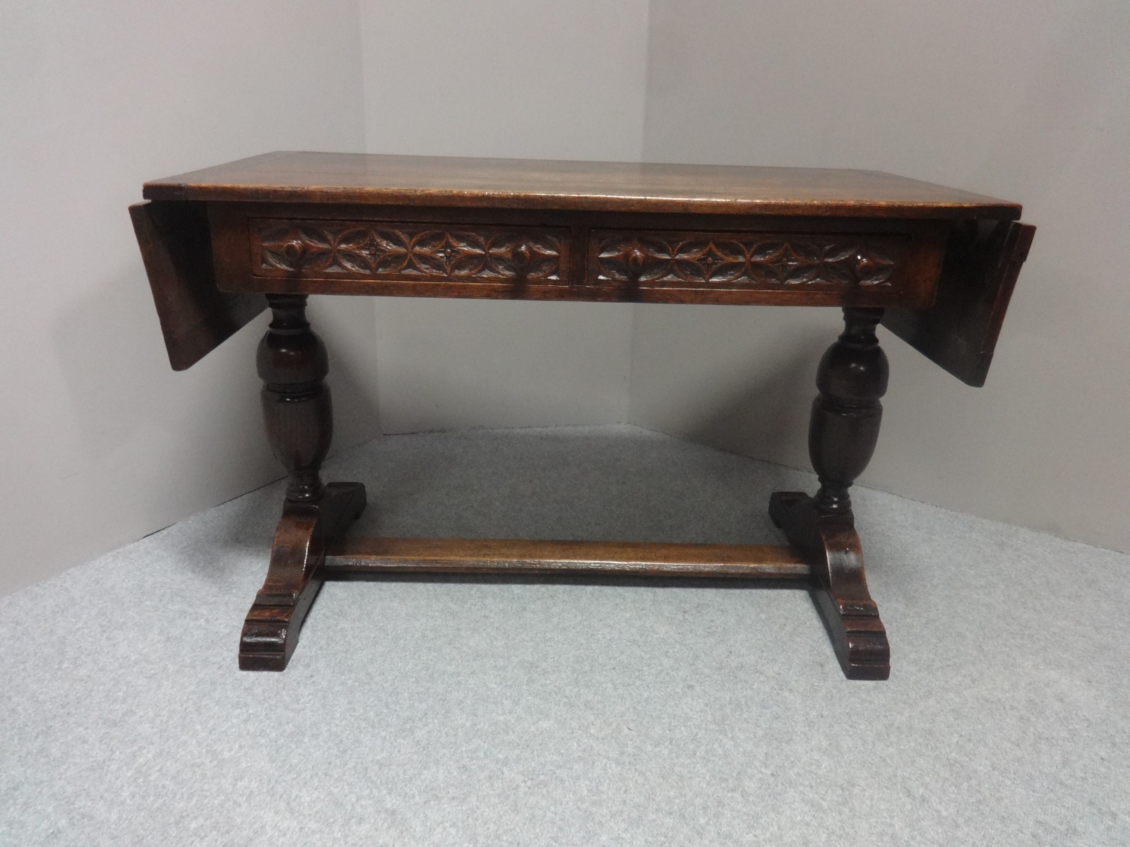 This is a good quality oak two drawer narrow table with two drawers and drop leaves, can be used as a dining refectory table, excellent colour and condition.