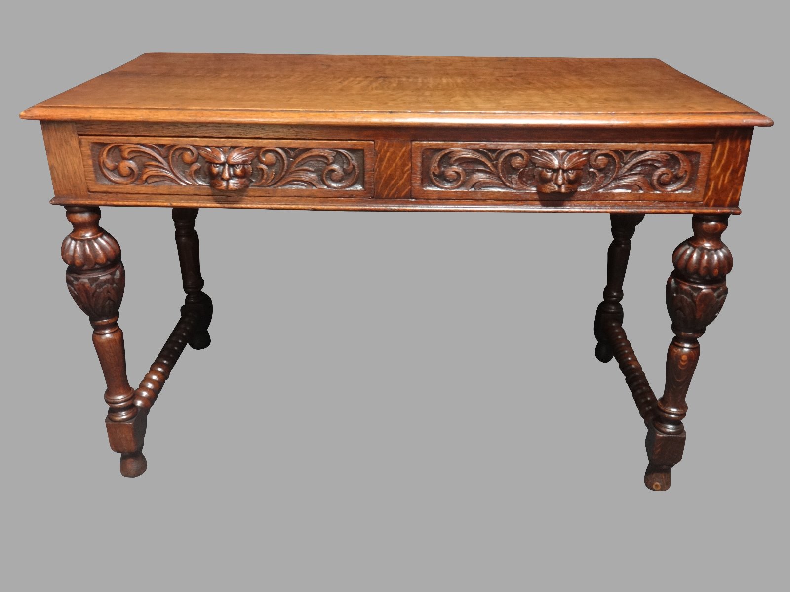 A good green man two drawer writing table, desk, standing on bulbous legs with bobbin turned stretcher, freestanding with polished back, in overall excellent condition and ready for the home.