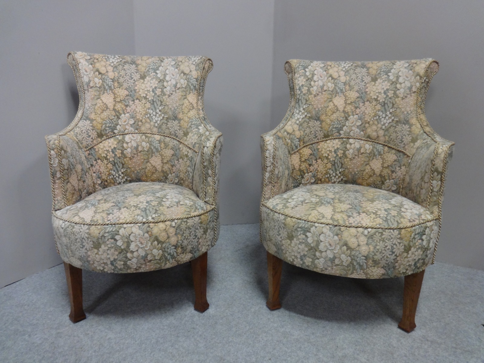 A very good pair of oak framed Arts and Crafts tub chairs, covered in tapestry fabric, in excellent condition.