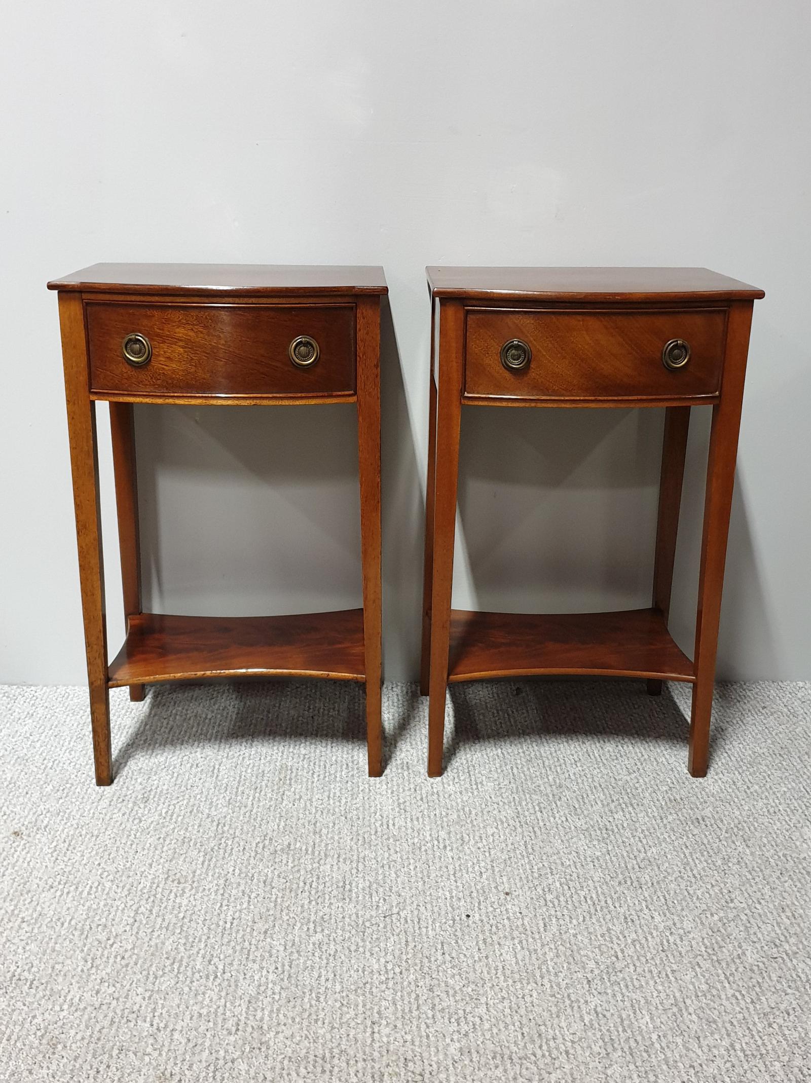 A very nice pair of flame mahogany bow front bedside lamp tables each with single drawer and lower shelf, brass handles, very nice condition.