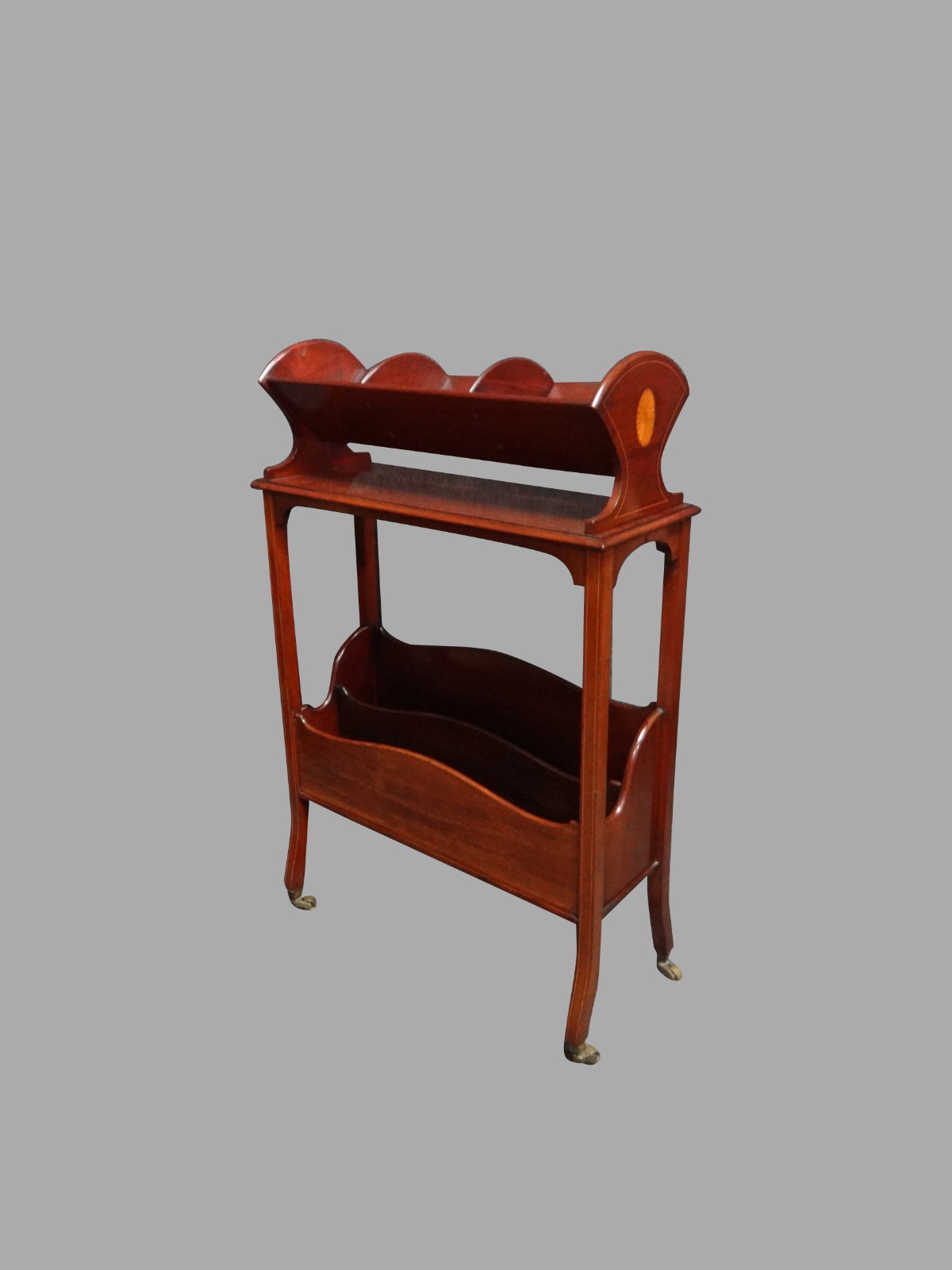 This is a top quality magazine rack/book trough with inlaid stringing and patrea, standing on brass cup castors, in excellent condition.