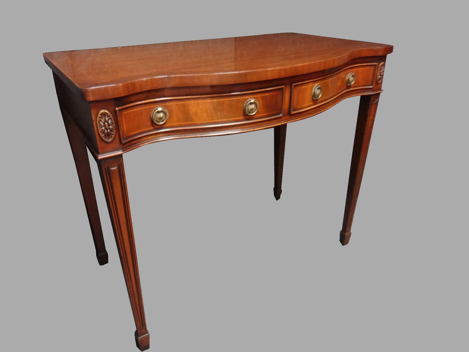 This is a good quality serpentine mahogany side table with two oak lined drawers, brass handles, standing on tapered legs, in excellent original condition.