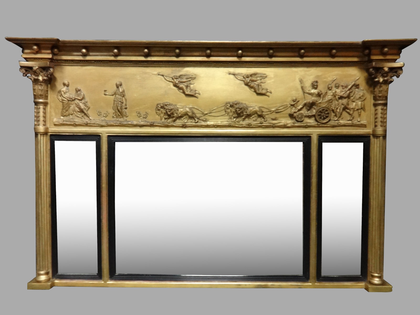 A very good triple plate Regency overmantle mirror with corinthian columns and roman scene to the top, slight foxing to original plate mirrors, but overall in excellent condition. Original gilding.