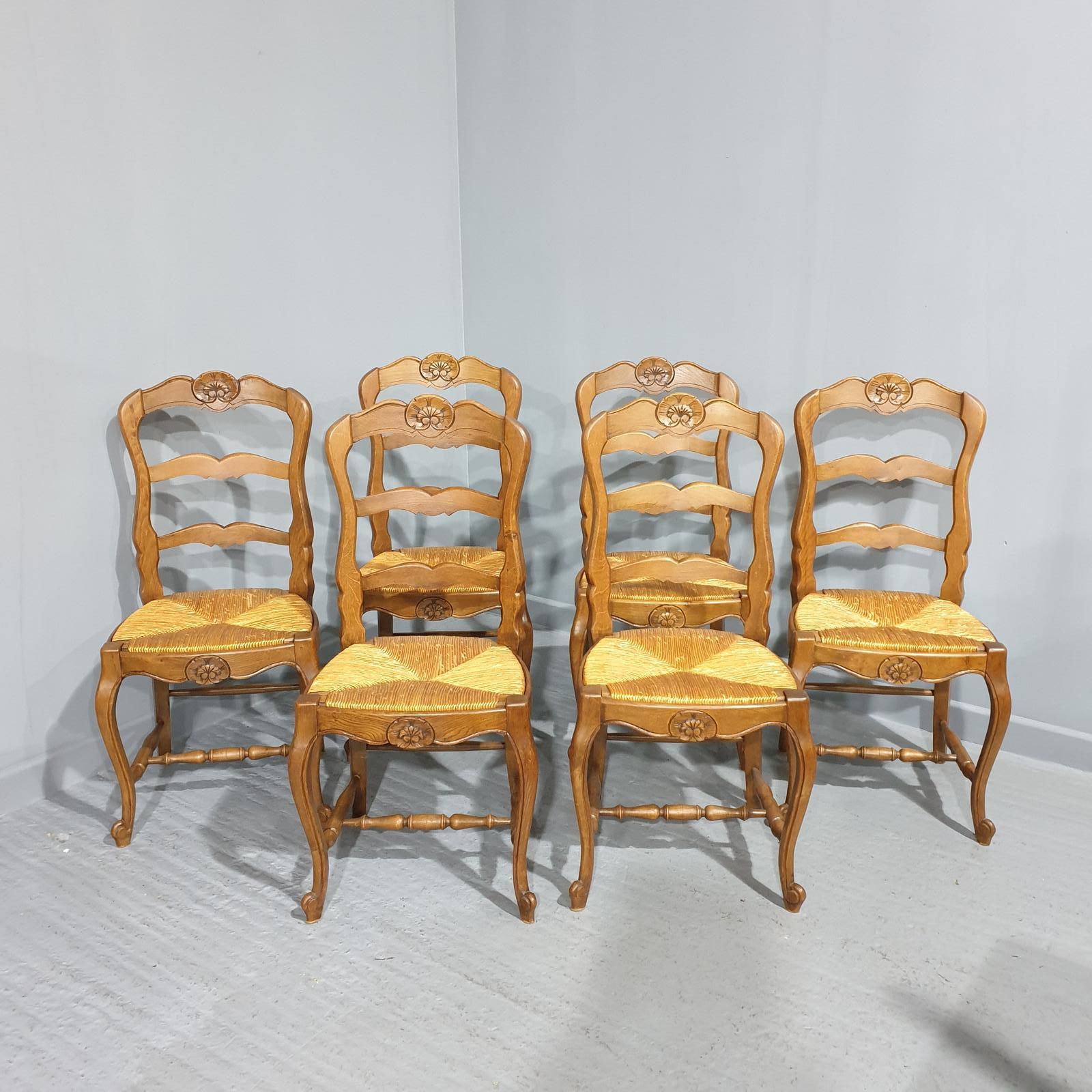 These are a nice set of French rush seated oak kitchen dining chairs, in excellent overall condition.