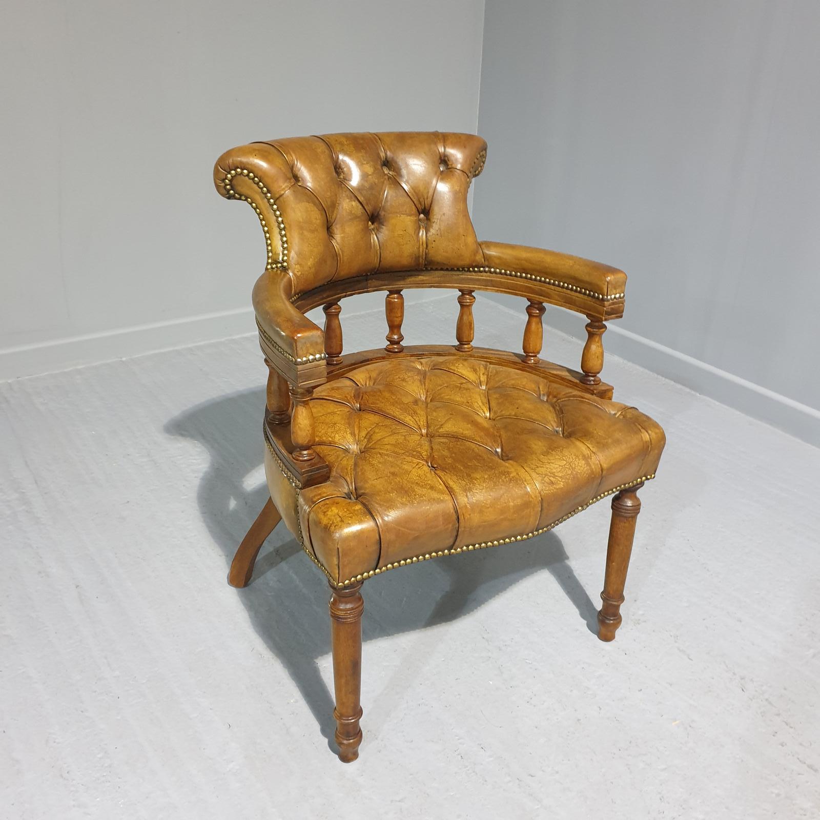 This is a very good 19th Century Victorian antique mahogany deep buttoned captain style tan leather office chair in excellent original condition.