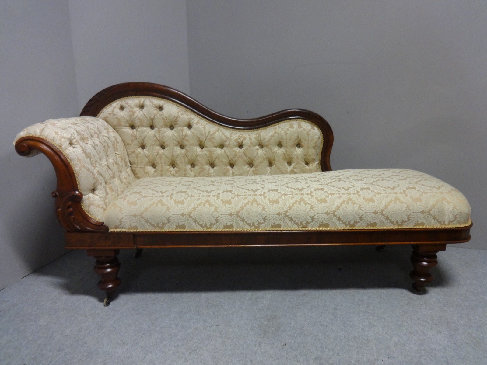 A very nice 19th Century Victorian antique mahogany left hand chaise lounge, recently upholstered in pale gold damask, very good colour and condition.