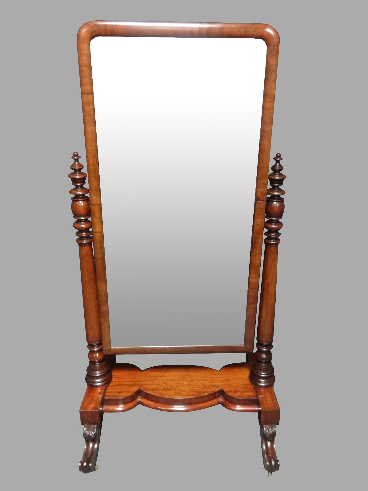 This is an excellent quality mahogany cheval mirror with shaped base, original brass castors, original mercury plate glass (slight foxing) but nothing detrimental, in all excellent condition.