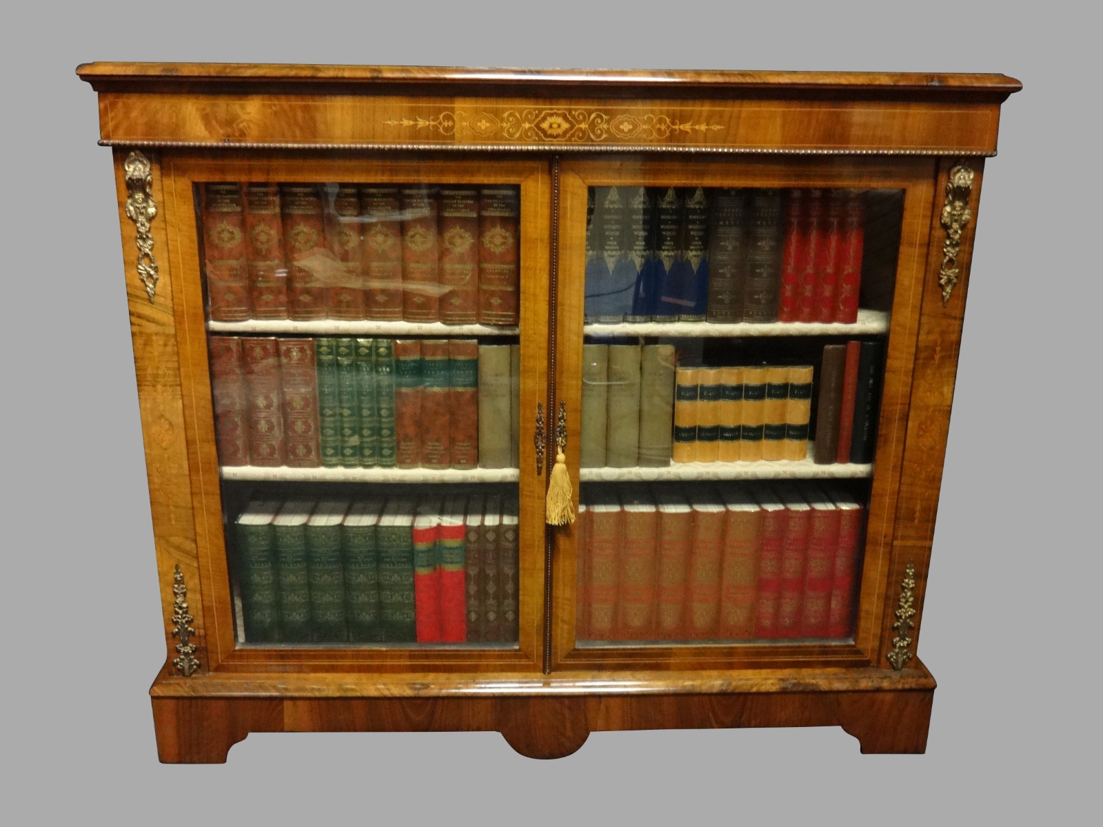 This is a very good Victorian walnut and burr walnut inlaid two door antique bookcase with two shelves, ormolu mounts, in very good overall condition.
