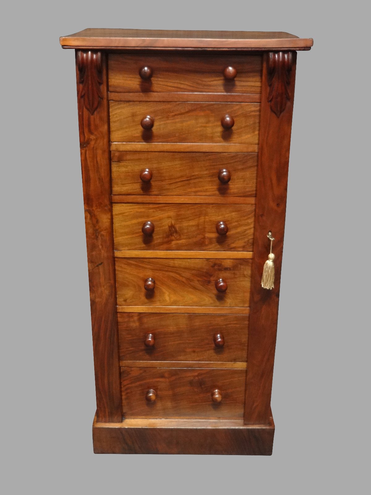 This is a very good 19th Century antique walnut wellington chest, in excellent condition with seven mahogany lined drawers, original lock with key.