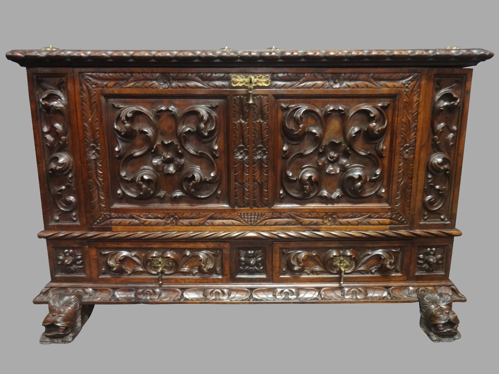 This is a very good 19th Century antique walnut cassone, very good under carving, two bottom drawers, brass handles and embelishments, in very good condition.