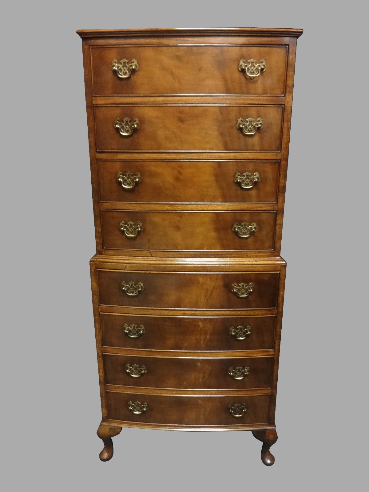 This is a very good bowed chest on chest of eight drawers, brass handles, splits into two, in very good condition.