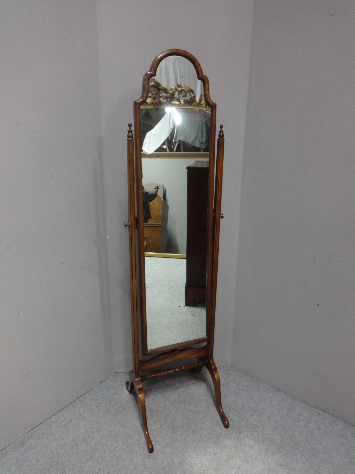 Offered for sale is this nicely shaped walnut cheval mirror, pivots on brass screws, in all very good condition.