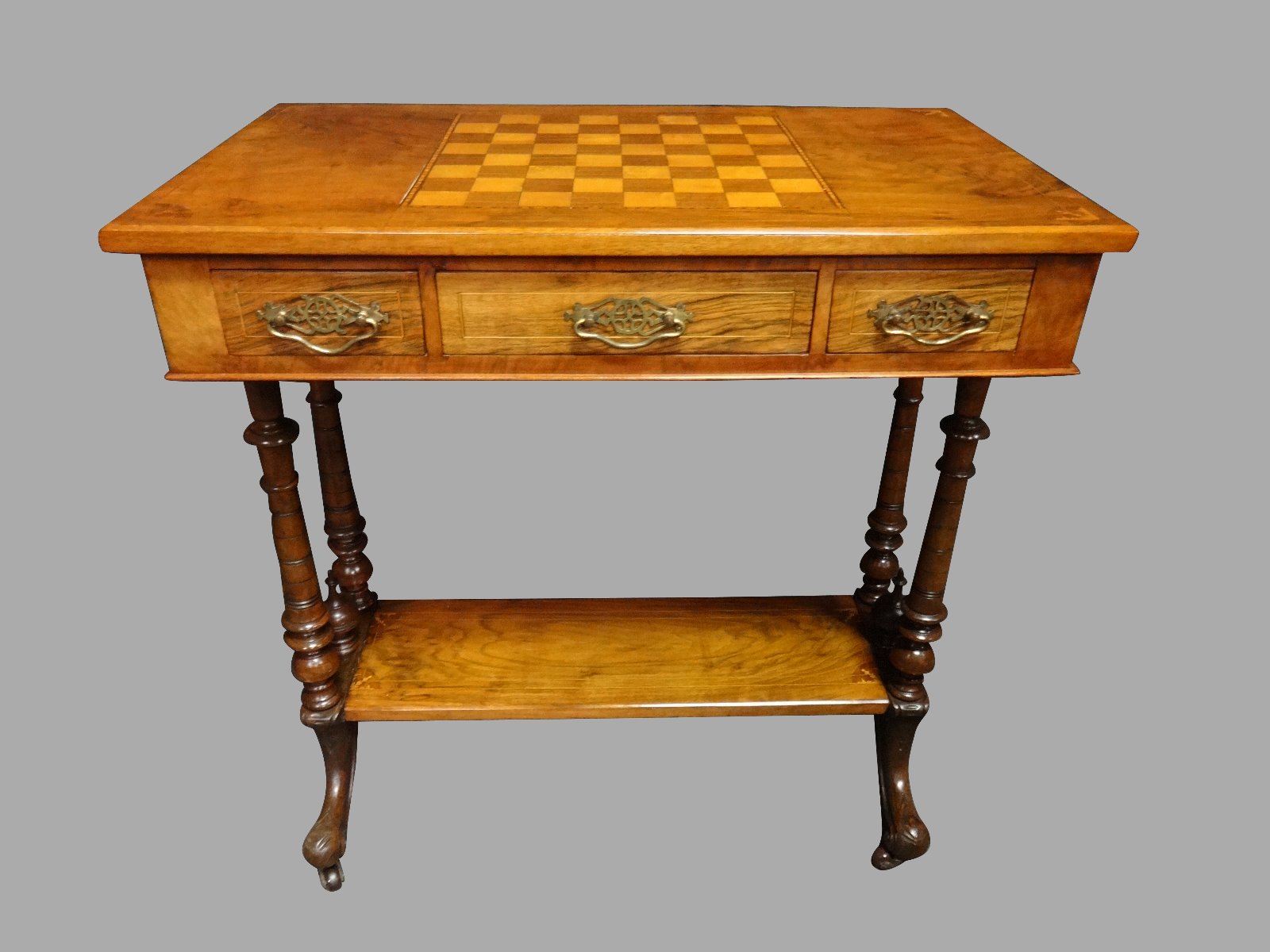 This is a very good 19th Century Victorian antique walnut inlaid games table, chess board top, three drawers, freestanding, in excellent condition.