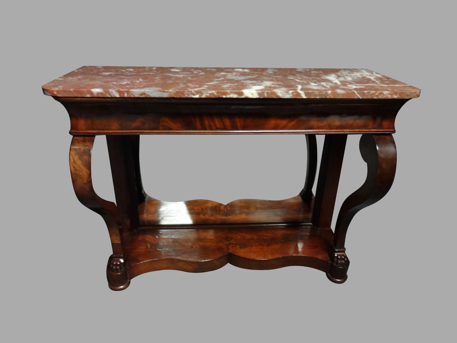 This is a very good 19th Century William IV antique mahogany console table with mirrored back beautiful rouge marble top and in excellent condition.
