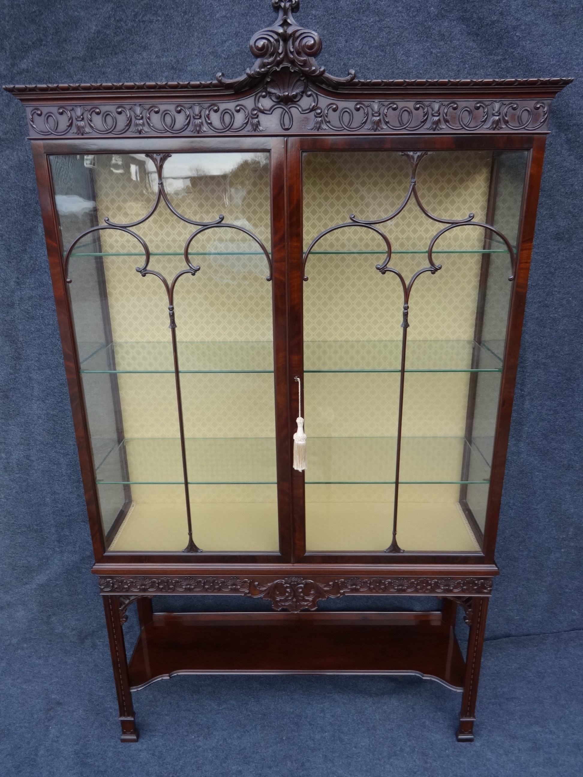 A very impressive and beautiful mahogany display cabinet that is in the Chippendale design. This fine antique cabinet has exceptional quality carvings, a brass lock, hinges and shelf supports and a 4 panel back. This cabinet is in fine original condition, relined interior.