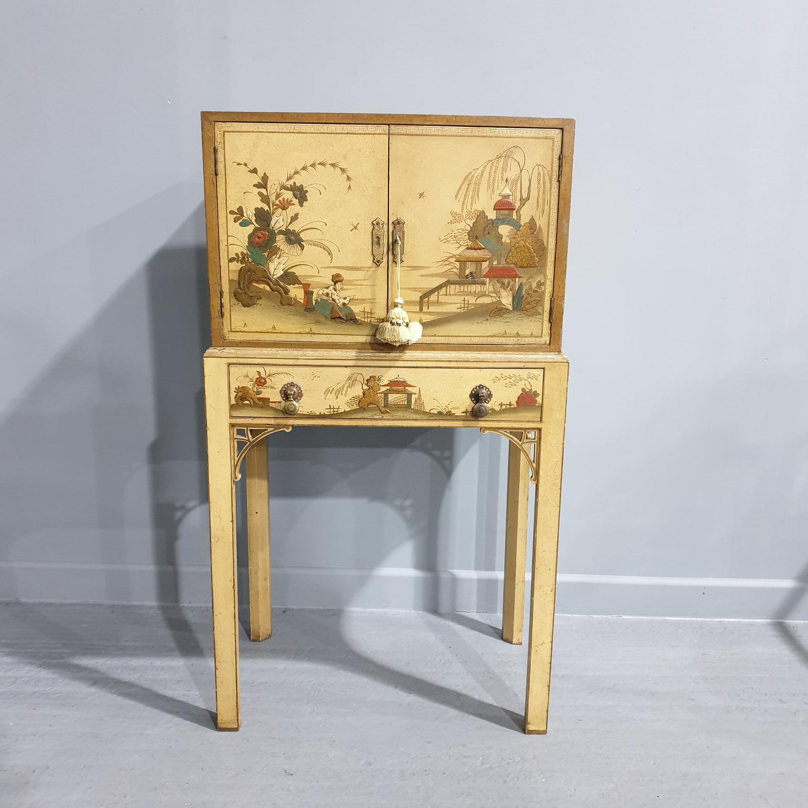 This is a lovely early 20th Century antique cream chinoiserie music cabinet on stand, in overall very good original condition.