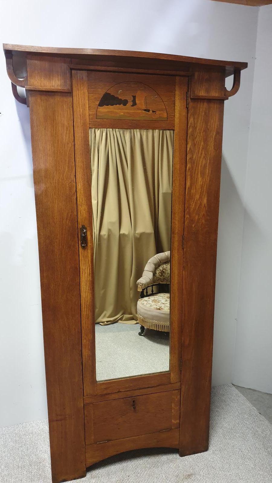 A very nice oak Art Noveau Liberty hall robe with inlaid panel over the mirror, drop down shoe box, shelving to the inside, solid oak and in superb original condition, slight foxing on mirror.