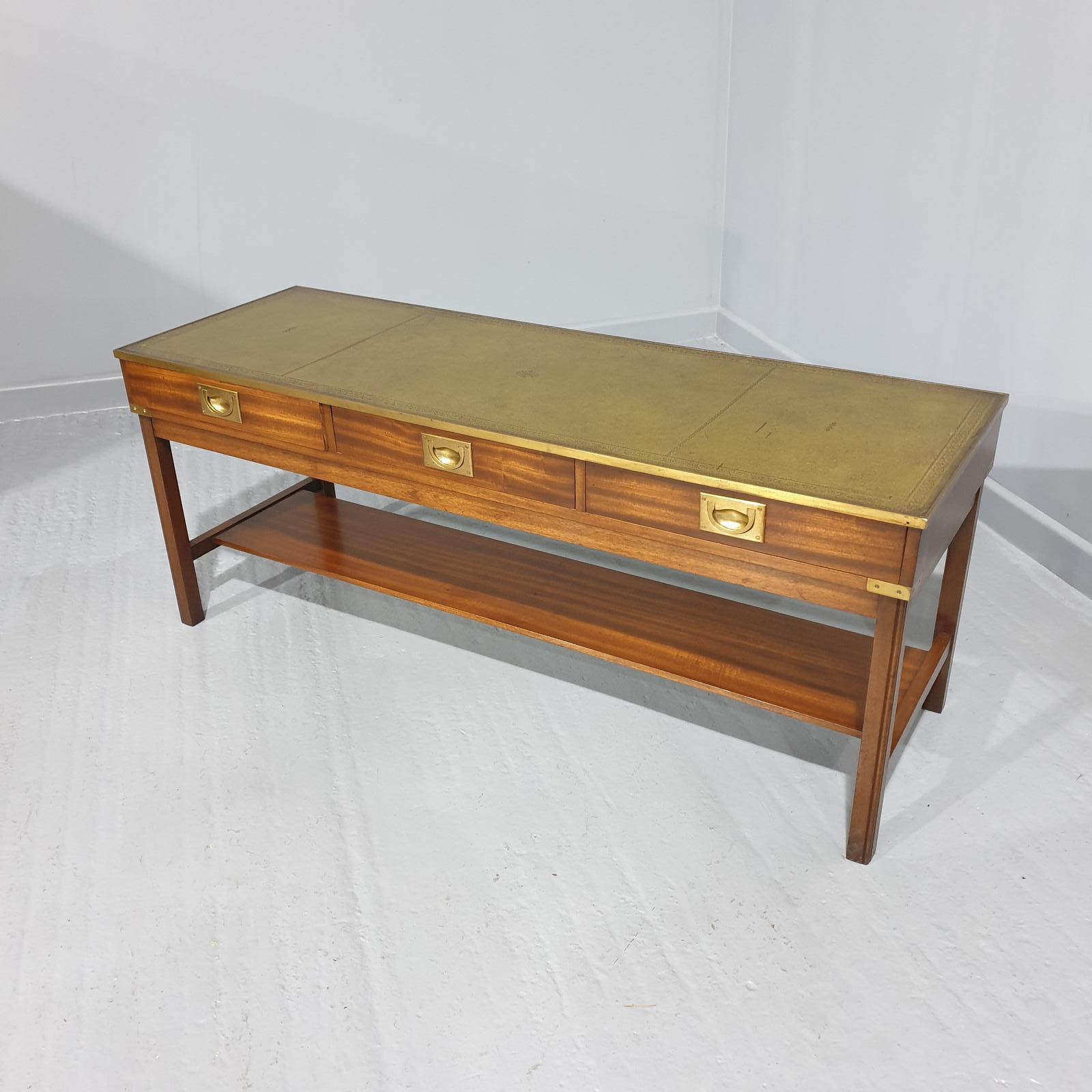 This is a very good freestanding mahogany coffee table green leather top with gilt tooling and brass edging, three opening drawers with inset brass handles and undertier, brass corner straps, in excellent original condition.