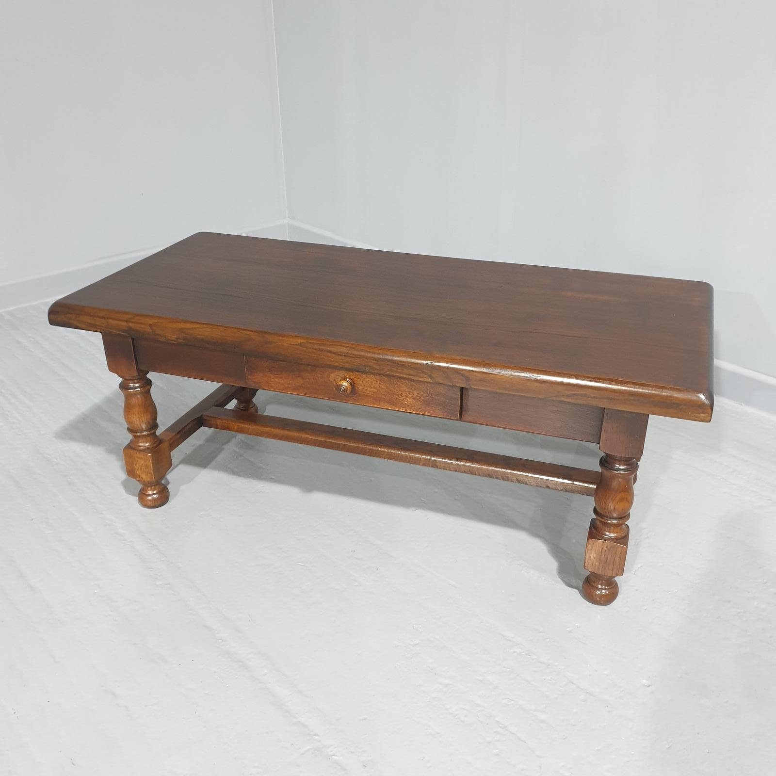 A very good and excellent quality solid oak plank coffee table with single drawer on turned legs, under stretcher, peg jointed throughout.