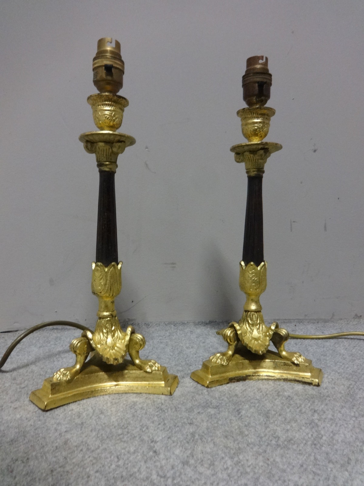 A lovely pair of gilt metal table lamps, with paw feet, rewired and ready for use.